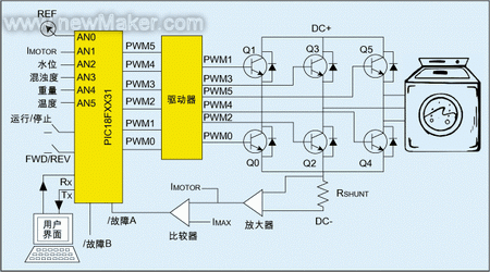 工业应用的效益是明显的,使用MCU驱动的变速电机控制依赖于其他因素,例如灵活性和可靠性-这些因素能避免故障或检修带来的停工。带有闪存和EEPROM的MCU提供能通过可再编程特性,在当需要升级或控制程序要求改变的时候来解决工业用户要求的灵活性。带16KB闪存和256B EEPROM的MCU在8位MCU中提供了足够的存储器来处理在工业环境中可能需要的很多改变。同样重要的是,Microchip公司的闪存采用的PMOS电子可擦除的单元处理技术一般具有数据存储单元能承受1百万次擦/写循环,数据可以保持超过40年的性能。